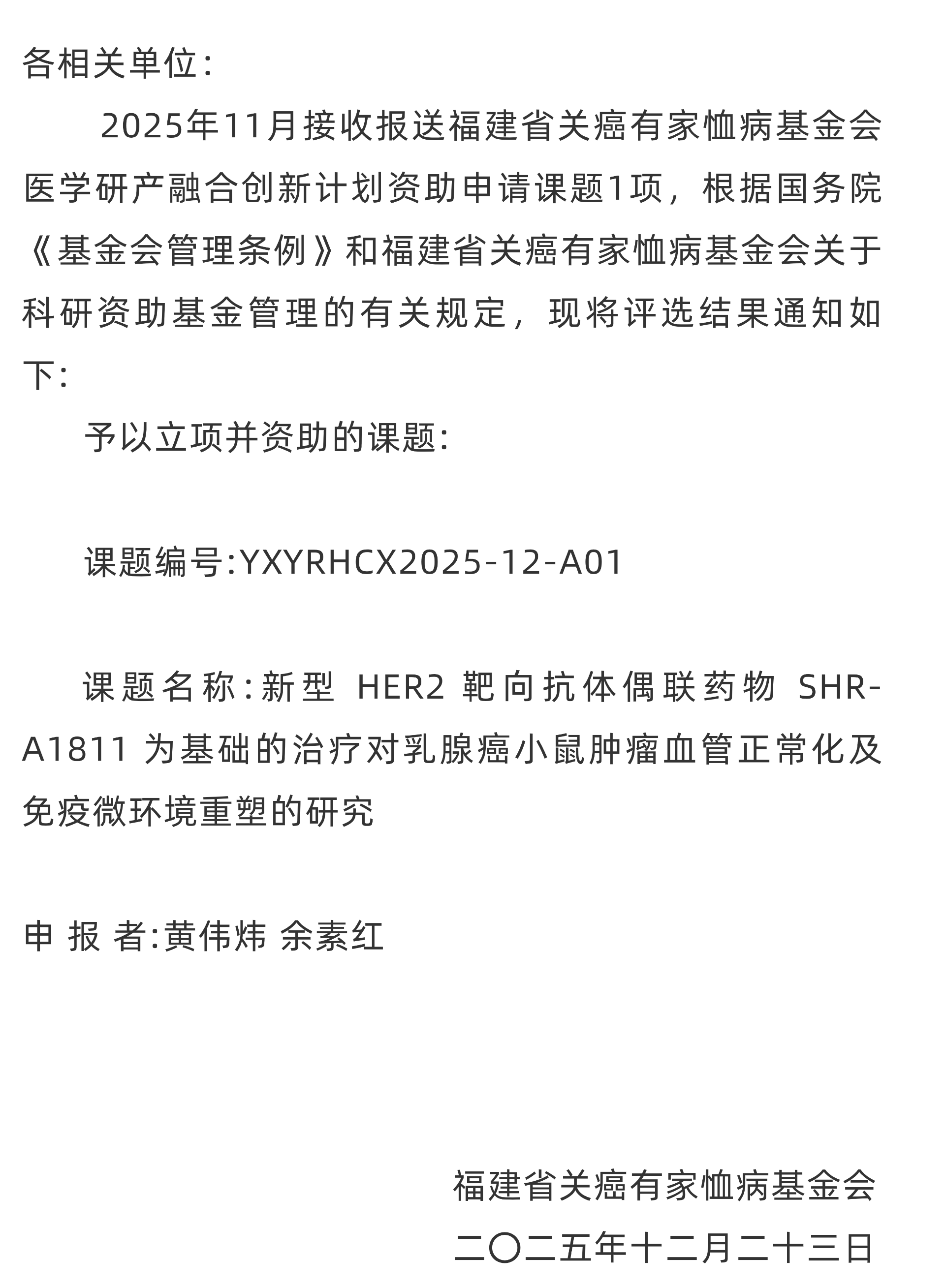 福建省关癌有家恤病基金会医学研产融合创新计划第一批课题立项公示